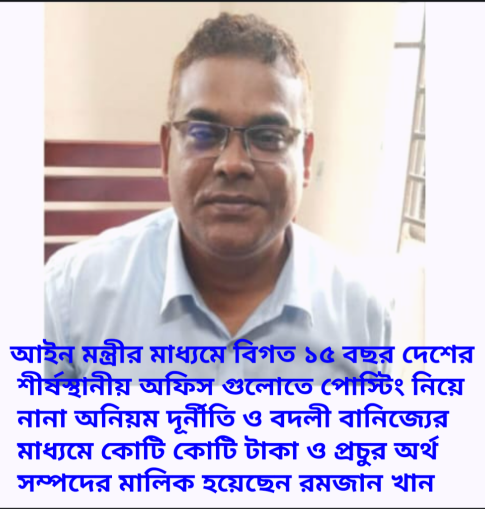 পতিত সরকারের সাবেক আইন মন্ত্রী আনিছুল হকের নির্বাচনী এলাকা আখাউড়া উপজেলায় বাড়ি হওয়ার সুবাদে আইন মন্ত্রীর মাধ্যমে বিগত ১৫ বছর দেশের শীর্ষস্থানীয় অফিস গুলোতে পোস্টিং নিয়ে নানা অনিয়ম দূর্নীতি ও বদলী বানিজ্যের মাধ্যমে কোটি কোটি টাকা ও প্রচুর অর্থ সম্পদের মালিক হয়েছেন মুন্সিগঞ্জের জেলা রেজিস্ট্রার মোঃ রমজান খান। বর্তমানে আইন মন্ত্রনালয়ের উচ্চ পদস্থ দুই কর্মকর্তার সঙ্গে সিন্ডিকেট গড়ে তিনি নতুন করে বদলী বানিজ্য শুরু করেছেন বলে কয়েক দিন আগে আইন উপদেষ্টার কাছে লিখিত অভিযোগ করা হয়েছে। এতে দেশের শীর্ষ দুর্নীতিবাজ আওয়ামী ক্যাডার ও সাব-রেজিস্ট্রার বদলী বানিজ্যের গডফাদার রমজান খানের দুর্নীতির মাধ্যমে জ্ঞাত আয় বহির্ভূত অবৈধ সম্পাদ অর্জন ও বদলী বানিজ্য করে বিদেশে কোটি কোটি টাকা পাচারের অভিযোগ তদন্ত পূর্বক আইনানুগ ব্যবস্থা গ্রহণের আবেদন করা হয়।
